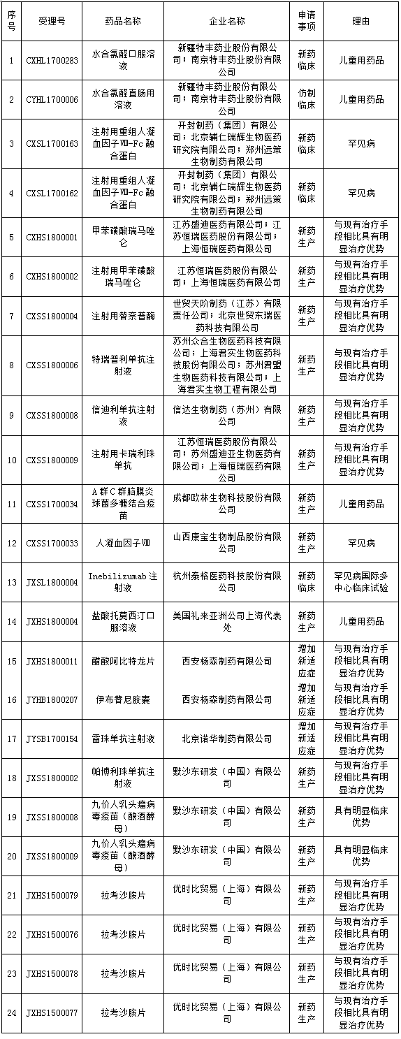 根據(jù)總局《關(guān)于鼓勵(lì)藥品創(chuàng)新實(shí)行優(yōu)先審評(píng)審批的意見》(食藥監(jiān)藥化管〔2017〕126號(hào)),我中心組織專家對(duì)申請(qǐng)優(yōu)先審評(píng)的藥品注冊(cè)申請(qǐng)進(jìn)行了審核論證,現(xiàn)將擬優(yōu)先審評(píng)的藥品注冊(cè)申請(qǐng)及其申請(qǐng)人予以公示,公示期5日。公示期間如有異議,請(qǐng)?jiān)谖抑行木W(wǎng)站“信息公開-->優(yōu)先審評(píng)公示-->擬優(yōu)先審評(píng)品種公示”欄目下提出異議。